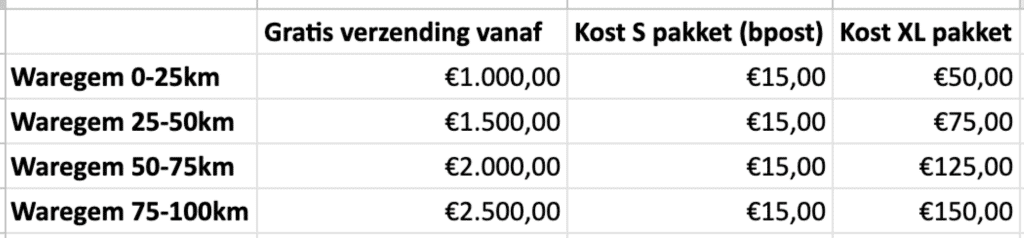 De verzendkosten hangen af van het type product en de afstand van Waregem. Kleine accessoires worden geleverd via pakketdienst, grotere producten zoals palen, rollen en poorten via speciaal transport. De exacte kosten worden getoond bij het afrekenen.