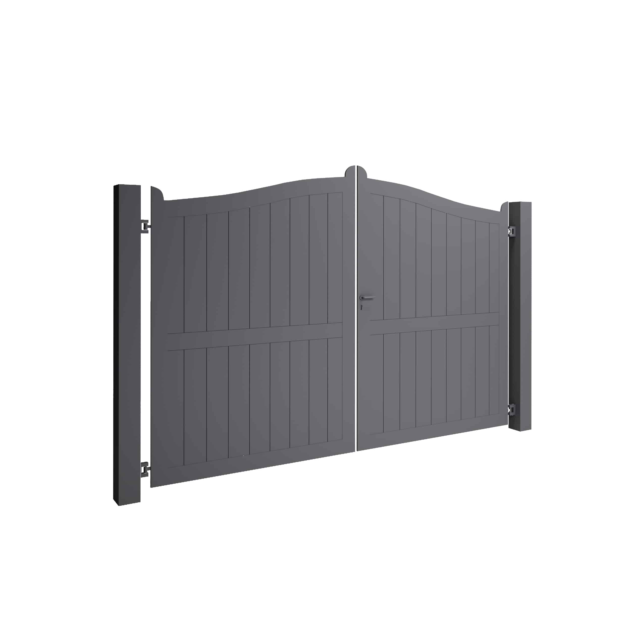 Deze dubbele draaipoort is perfect voor wie een brede toegang wenst met een traditionele uitstraling. De verticale planchetten, onderbroken door een horizontale versteviging en afgewerkt met een sierlijke boog, geven de Perth-BLB een warme, landelijke stijl. Volledig gesloten, en beschikbaar in verschillende kleuren en afmetingen.